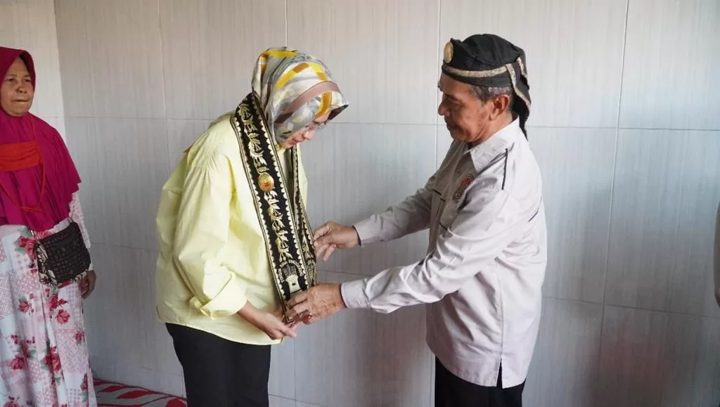 Tokoh Perempuan Banten, Airin Rachmi Diany dikalungi selendang keluarga Aria Wangsakara oleh Bale Adat Parahiyang saat berkunjung di wilayah Jatiuwung, Kota Tangerang, Kamis (21/12/2023).