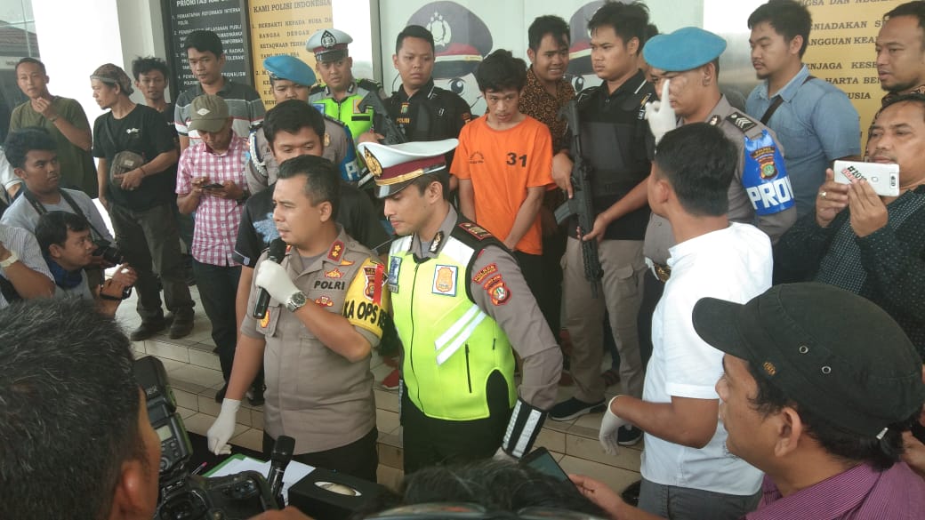 Kapolres Tangsel AKBP Ferdi Irawan melangsungkan jumpa pers di halaman Mapolres Tangerang Selatan, Serpong, Tangsel, Jumat (8/2/2019). Adi Saputra dihadirkan dengan menngunakan baju tahanan berwarna orange.