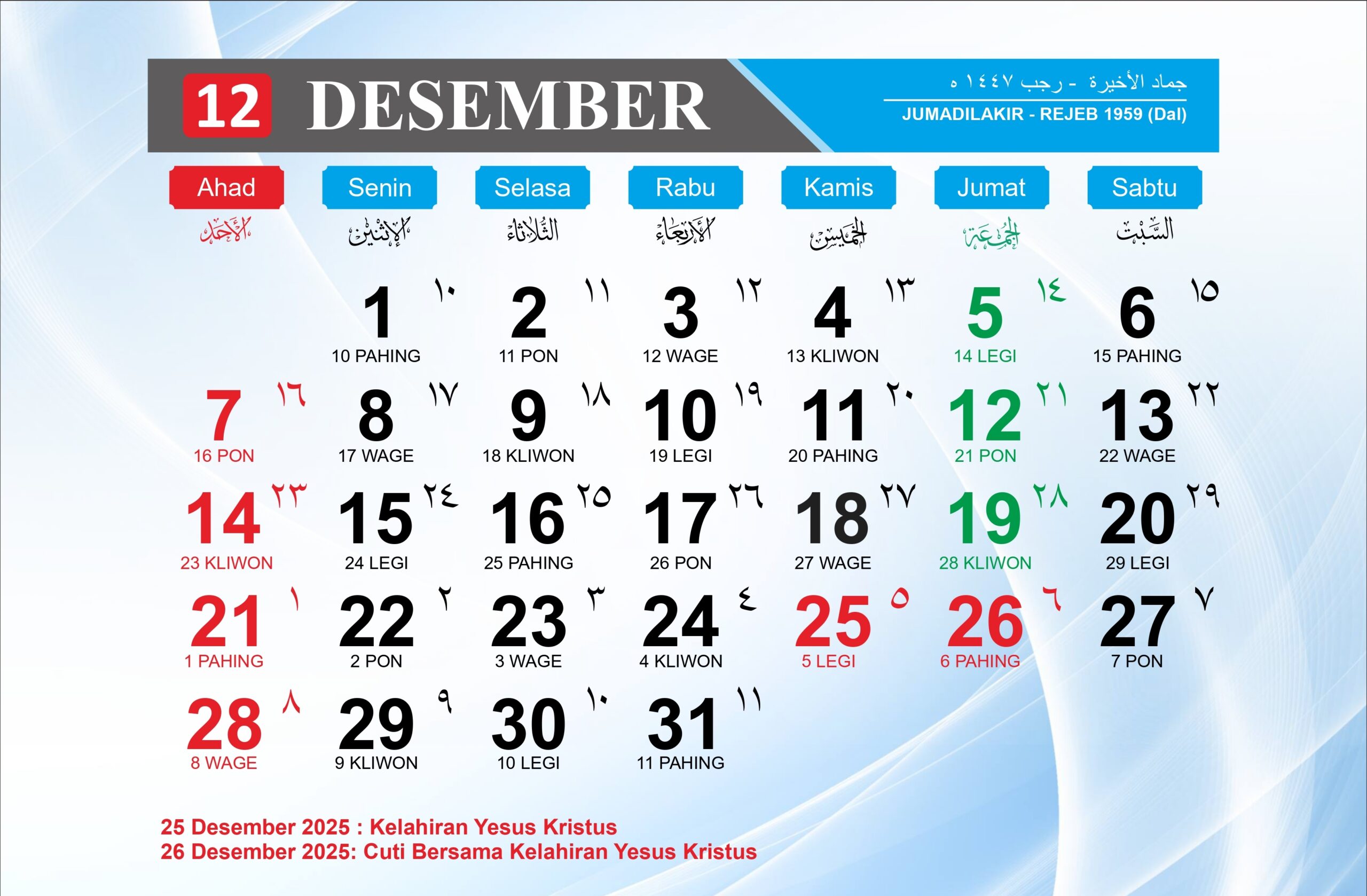 Berikut kalender Desember 2025, dilengkapi pasaran Jawa (weton), tanggal Hijriah, serta daftar hari libur nasional dan cuti bersama.