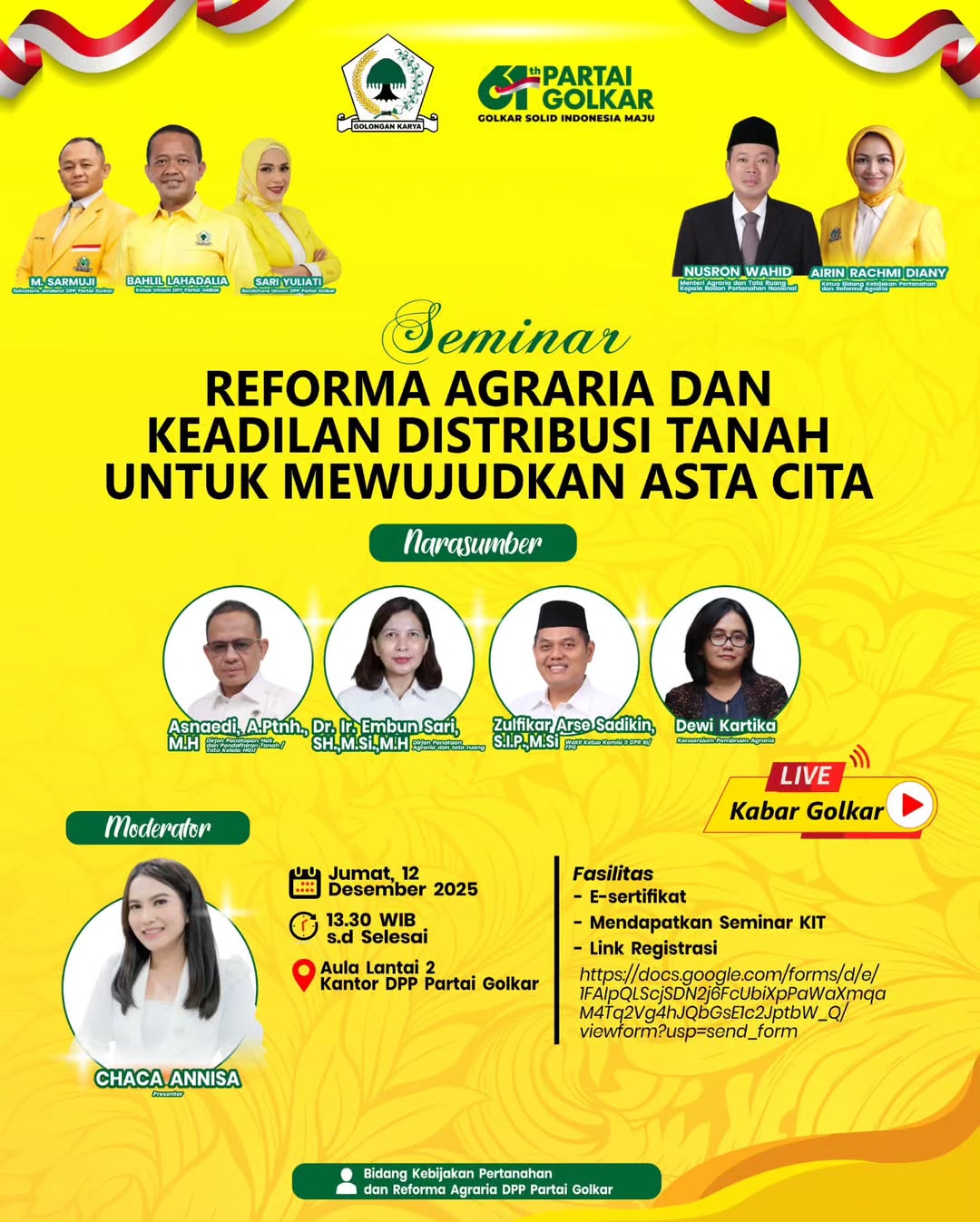 Dalam rangka memperingati Hari Ulang Tahun (HUT) Partai Golkar ke-61, Bidang Kebijakan Pertanahan dan Reforma Agraria DPP Partai Golkar menggelar seminar nasional bertajuk “Reforma Agraria dan Keadilan Distribusi Tanah untuk Mewujudkan Asta Cita” pada Jumat, 12 Desember 2025.