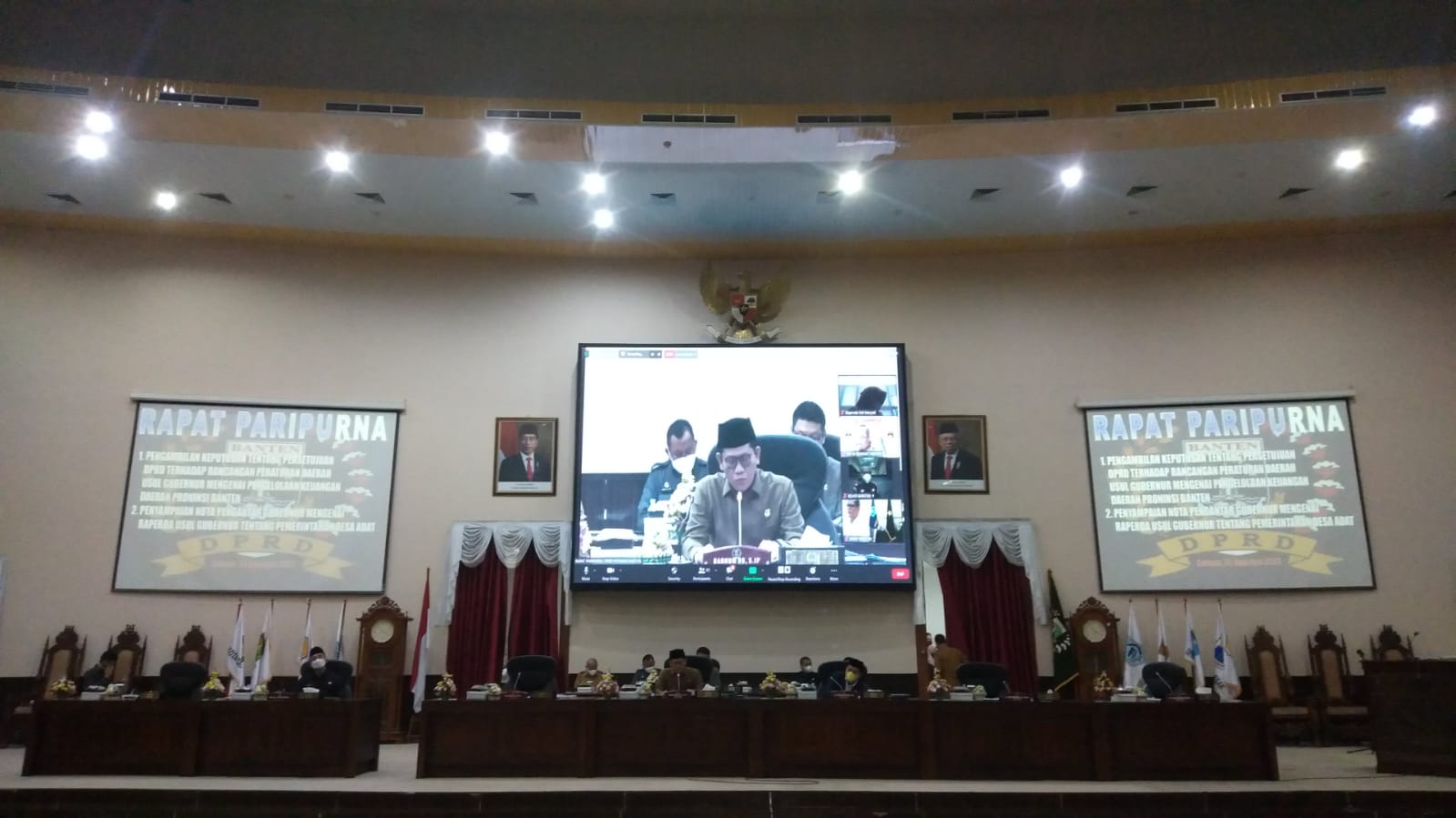 Dewan Perwakilan Rakyat Daerah (DPRD) Provinsi Banten mengelar rapat paripurna dengan agenda rapat pengambilan keputusan tentang persetujuan DPRD terhadap Rancangan Peraturan Daerah (Raperda) usul gubernur mengenai pengelolaan keuangan daerah Provinsi Banten dan penyampaian nota pengantar gubernur mengenai raperda usul gubernur tentang pemerintahan desa adat yang bertempat di ruang rapat paripurna DPRD Banten pada Selasa, (31/08/2021)