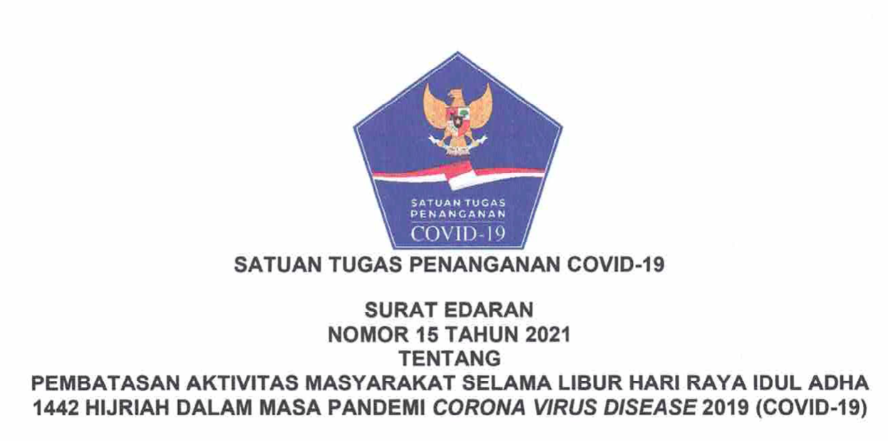 Satuan Tugas (Satgas) Penanganan COVID-19 menerbitkan Surat Edaran (SE) Nomor 15 Tahun 2021 terkait pembatasan aktivitas masyarakat selama libur Hari Raya Idul Adha 1442 Hijriah/2021. SE yang ditandatangani Ketua Satgas Penanganan COVID-19 Ganip Warsito pada tanggal 17 Juli ini berlaku efektif pada tanggal 18 hingga 25 Juli 2021.