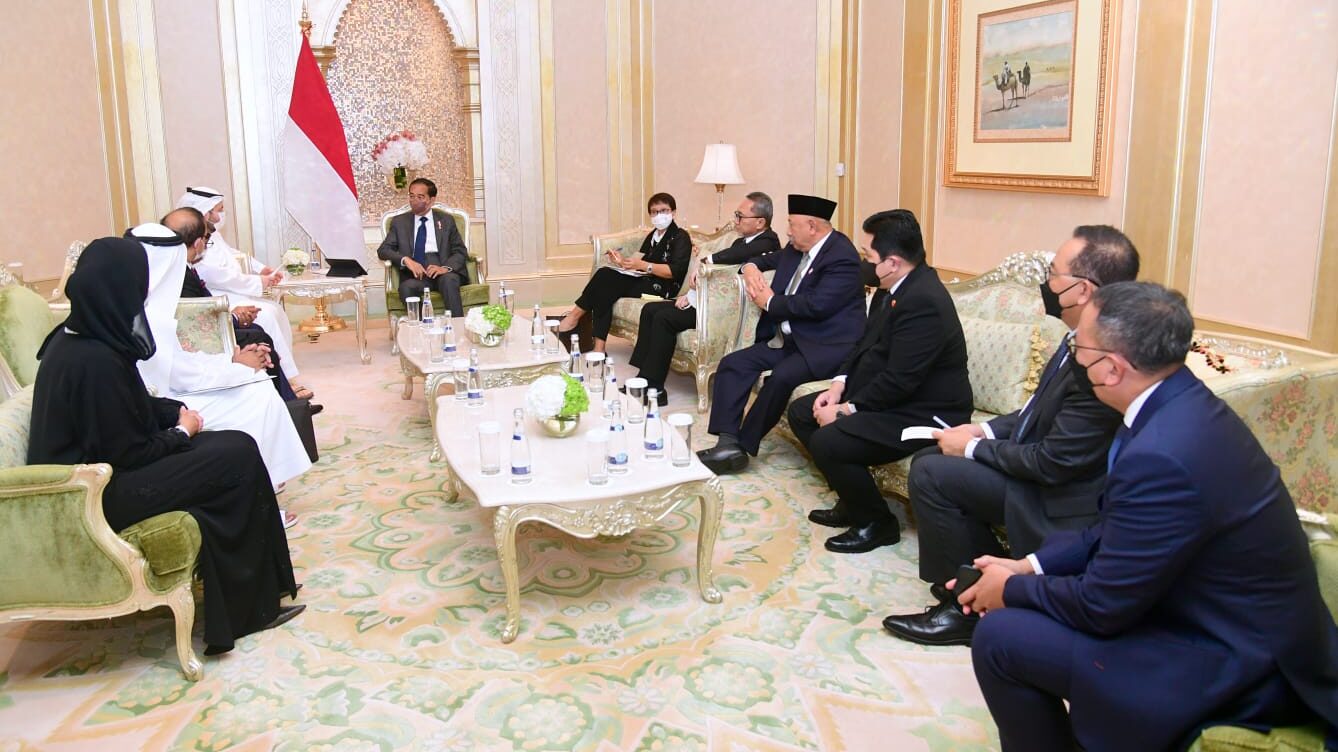 Dalam kunjungan kerjanya ke Persatuan Emirat Arab (PEA), Presiden Joko Widodo berdialog dengan sejumlah investor dan pengusaha di Hotel Emirates Palace, Abu Dhabi, PEA, pada Jumat, 1 Juli 2022. Menteri BUMN Erick Thohir yang turut serta dalam pertemuan mengatakan bahwa para investor dan pengusaha PEA optimistis untuk bekerja sama dalam beberapa proyek kedua negara.