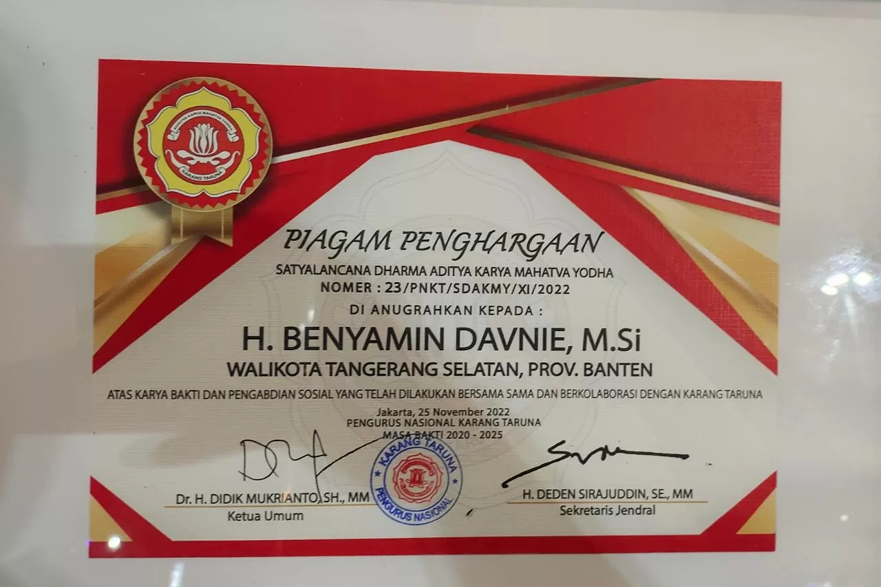 Wali Kota Tangerang Selatan (Tangsel) Benyamin Davnie menerima penghargaan Satyalancana Dharma Aditya Karya Mahatva Yodha atas karya bakti dan pengabdian sosial, yang telah dilakukan bersama-sama dan berkolaborasi dengan karang taruna. Sertifikat penghargaan diberikan oleh Pengurus Nasional Karang Taruna.