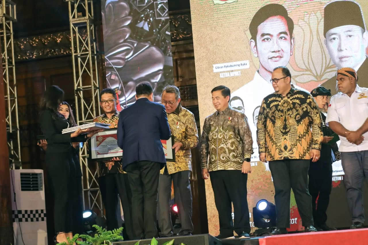 Penghargaan Satyalancana Aditya Karya Mahatva Yodha (AKMY) diterima Wali Kota Benyamin Davnie dalam perhelatan Malam Penganugerahan AKMY Award 2022 sebagai rangkaian dari Bulan Bhakti Karang Taruna (BBKT) 2022 di Pendopo Walikota Surakarta, Jawa Tengah, Rabu (30/11/2022) malam.