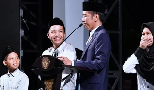 Dalam unggahannya, Jokowi memposting foto bersama tiga santri di sampingnya. Tampak Presiden tengah bercengkeram dengan santri yang berada di dekatnya dengan mengenakan jas biru tua dan peci hitam.