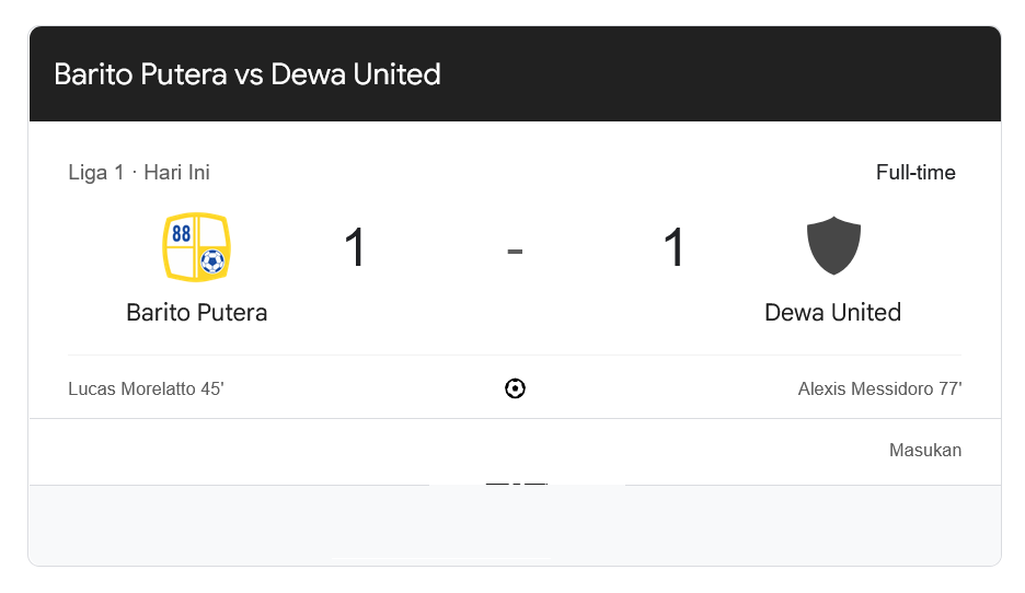 Hasil imbang ini membuat kedua tim harus puas berbagi satu poin. Barito Putera dan Dewa United kini sama-sama berusaha memperbaiki posisi mereka di klasemen sementara Liga 1.