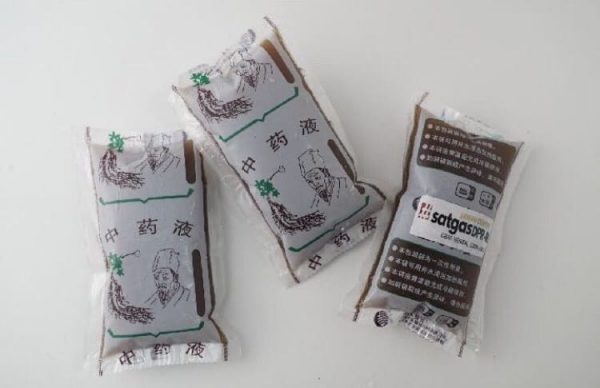 Di kemasan bagian depan bertuliskan kanji China 中药液 (中药 traditional chinese medicine, TCM atau obat tradisional China dan 液 liquid atau cairan).