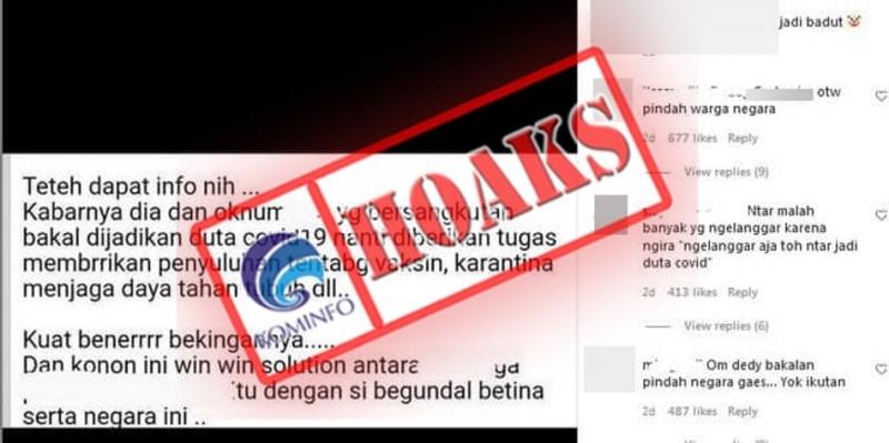 Beredar sebuah unggahan di media sosial Instagram, informasi yang menyatakan bahwa selebgram Rachel Vennya akan dinobatkan menjadi Duta Covid-19. Disebutkan pula tugasnya akan memberikan penyuluhan tentang vaksin, karantina, dan menjaga daya tahan tubuh.