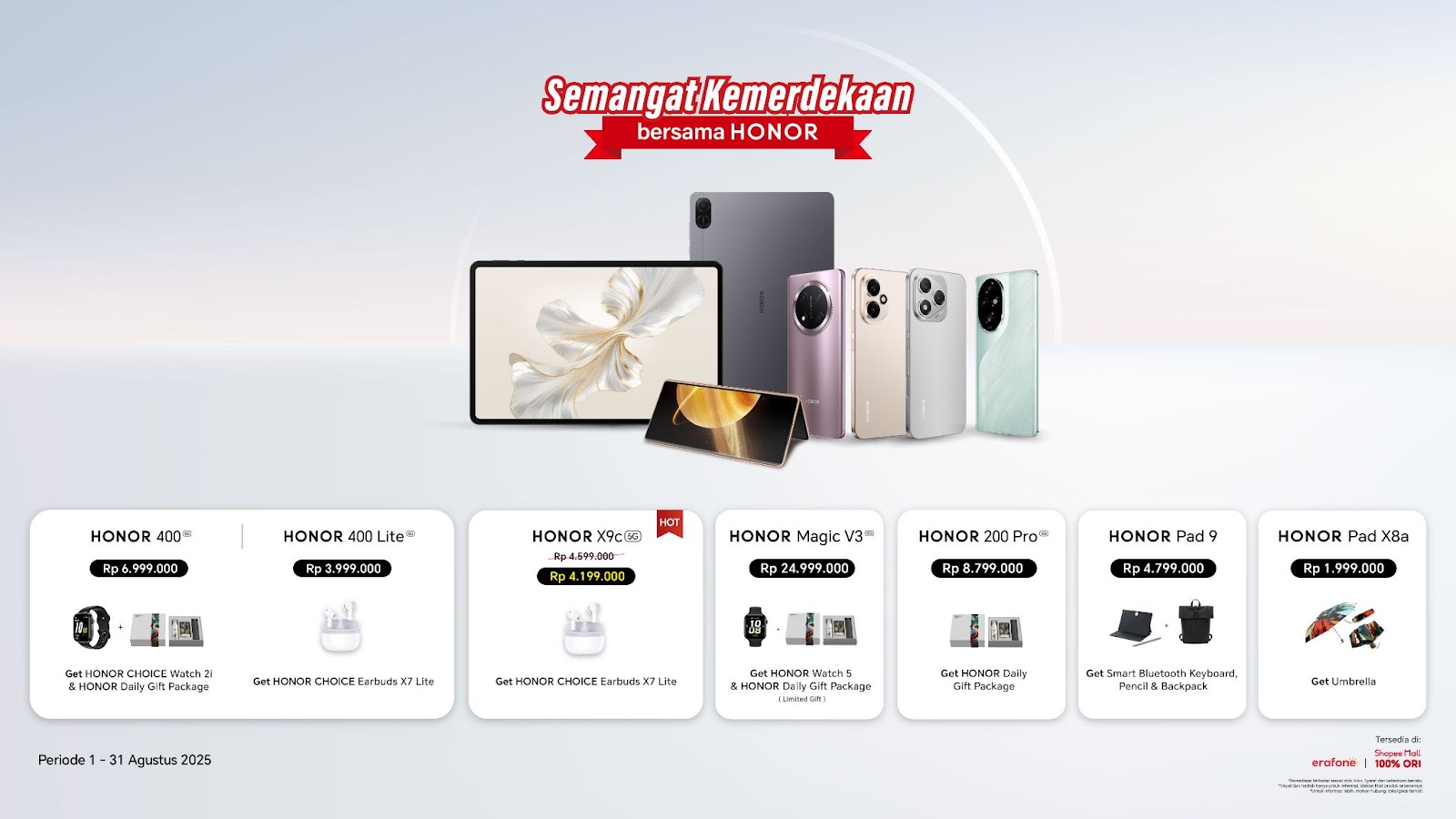 HONOR, merek teknologi global terkemuka, menyambut momen spesial Hari Kemerdekaan Republik Indonesia di bulan Agustus dengan menghadirkan penawaran menarik untuk dua produknya yang telah menjadi favorit konsumen di Indonesia, yakni HONOR 400 dan HONOR X9c. HONOR 400 memiliki kamera berbasis AI canggih yang memungkinkan siapa saja menciptakan konten berkualitas profesional dengan mudah. Sementara itu, HONOR X9c unggul berkat ketangguhannya yang memberikan perlindungan maksimal untuk penggunaan sehari-hari.