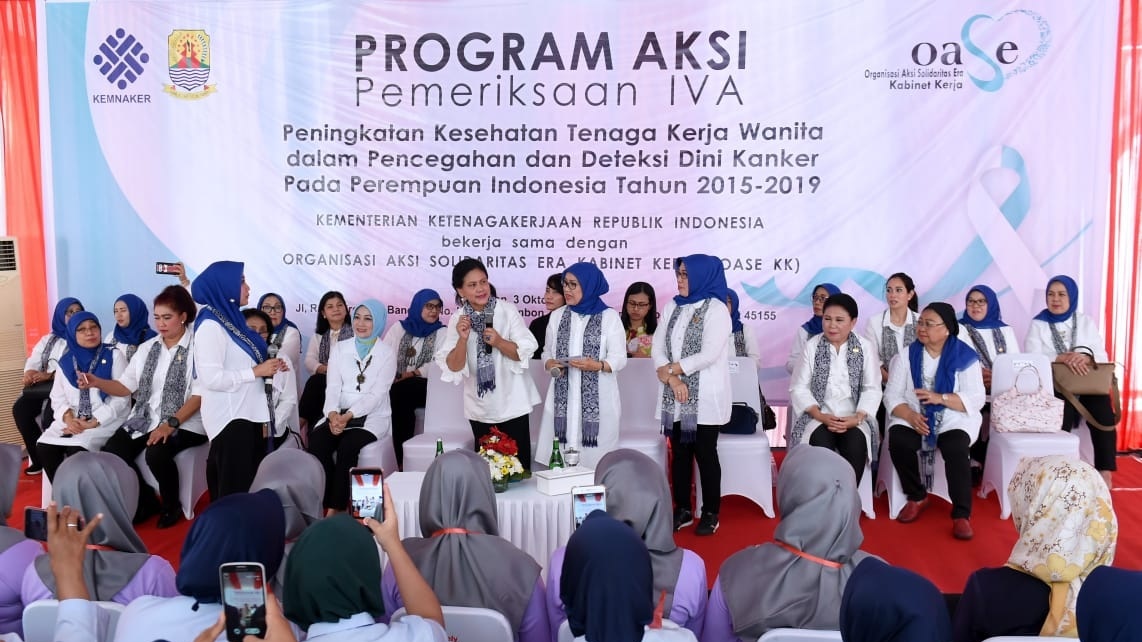 Ibu Negara Iriana Joko Widodo beserta Ibu Mufidah Jusuf Kalla melanjutkan kunjungan kerjanya di Kabupaten Cirebon, Jawa Barat, pada Kamis, 3 Oktober 2019, dengan meninjau Program Aksi Pemeriksaan Inspeksi Visual Asam Asetat (IVA).