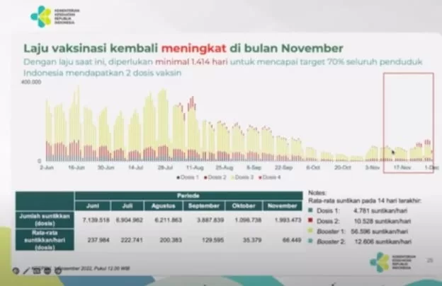 Meskipun laju vaksinasi sempat mengalami penurunan pada bulan sebelumnya, mulai pertengahan November kemarin angka sudah mulai bergerak naik Kembali ke pertengahan November yang lalu. Mudah mudahan vaksin ketiga dan keempat akan semakin meningkat untuk mencapai cakupan yang dicapai WHO 70% atau diatas 50% untuk vaksinasi booster, tandasnya.
