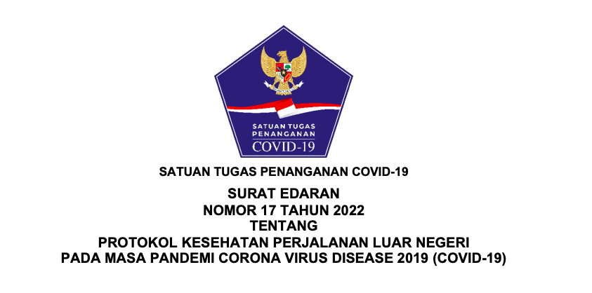 Satuan Tugas Penanganan COVID-19 menerbitkan Surat Edaran (SE) Nomor 17 Tahun 2022 tentang Protokol Kesehatan Perjalanan Luar Negeri pada Masa Pandemi Corona Virus Disease 2019 (COVID-19). SE yang ditandatangani oleh Ketua Satgas Suharyanto pada tanggal 5 April tersebut berlaku efektif sejak tanggal 5 April.