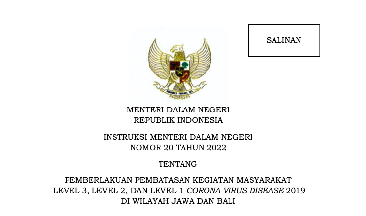 Menteri Dalam Negeri (Mendagri) Tito Karnavian menerbitkan Instruksi Menteri Dalam Negeri (Inmendagri) Nomor 20 Tahun 2022 tentang Pemberlakuan Pembatasan Kegiatan Masyarakat (PPKM) Level 3, Level 2, dan Level 1 Corona Virus Disease 2019 (COVID-19) di Wilayah Jawa dan Bali yang berlaku efektif mulai tanggal 5 April hingga 18 April 2022.