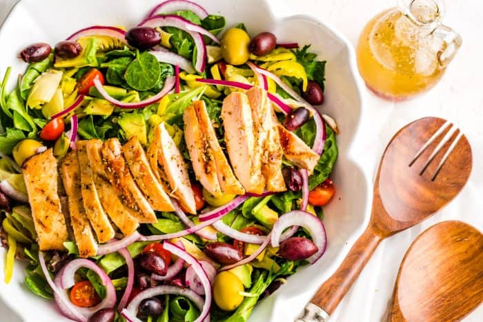 Kaya akan kandungan protein dan lemak bermanfaat, salad Mediterania dengan ayam panggang akan memberikan Anda energi untuk beraktivitas hingga sore hari.