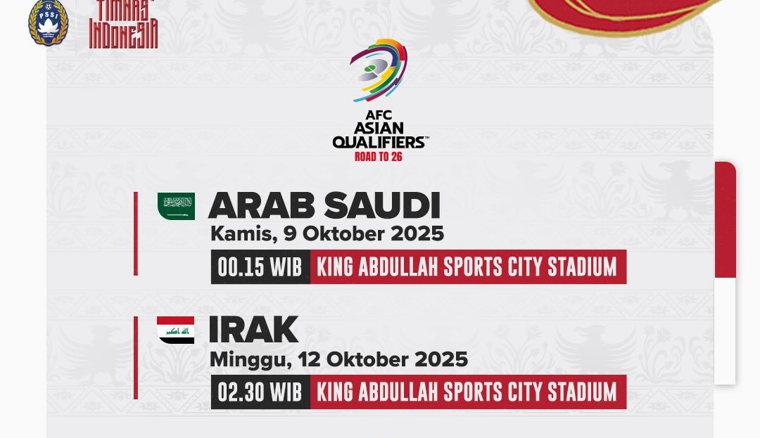 Timnas Indonesia akan menghadapi tantangan berat di Round 4 Asian Qualifiers Road to 26. Skuad Garuda bakal berhadapan dengan dua raksasa Asia, yakni Arab Saudi dan Irak, pada Oktober mendatang.