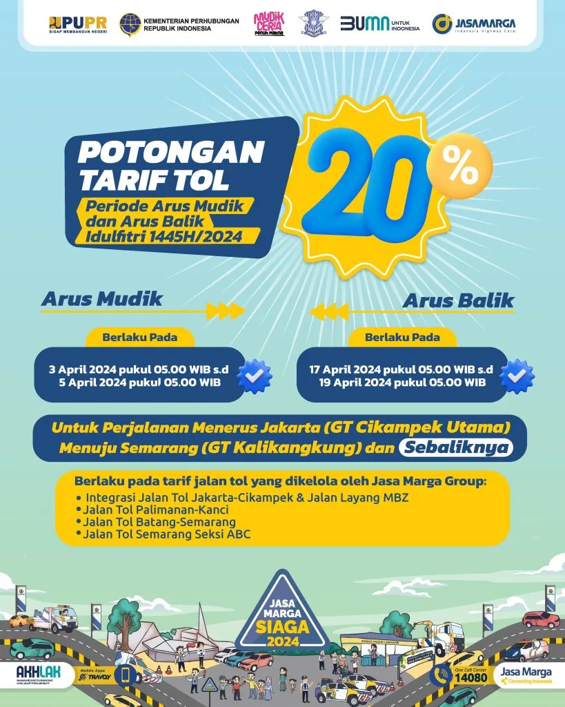 PT Jasa Marga (Persero) Tbk akan memberikan potongan tarif tol sebesar 20% untuk Jalan Tol Trans Jawa dari Jakarta menuju Semarang dan sebaliknya pada periode arus mudik dan balik Hari Raya Idul Fitri 1445H/Lebaran 2024. Potongan tarif tol 20% ini berlaku untuk tarif jalan tol yang dikelola oleh Jasa Marga Group yaitu integrasi Jalan Tol Jakarta-Cikampek & Jalan Layang MBZ, Jalan Tol Palimanan-Kanci, Jalan Tol Batang-Semarang dan Jalan Tol Semarang Seksi ABC.