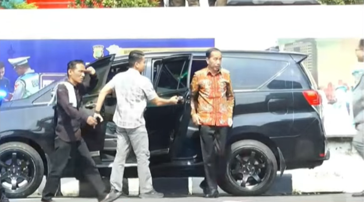 Jokowi tiba sekitar pukul 09.50 WIB. Ia tampak mengenakan kemeja batik lengan panjang dan didampingi oleh tim kuasa hukumnya.