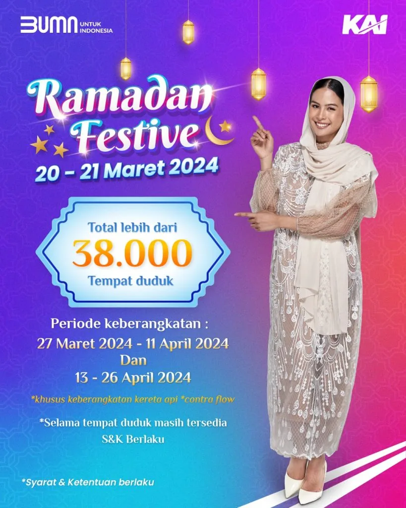 PT Kereta Api Indonesia (Persero) menghadirkan program Ramadan Festive 2024, dimana masyarakat dapat membeli total lebih dari 38.000 tiket kereta api dengan dengan potongan harga khusus. Ramadan Festive 2024 dilaksanakan dengan 2 mekanisme yaitu Promo Reguler dengan kuota 32.720 tempat duduk dan Promo Flash Sale dengan kuota 6.000 tempat duduk.
