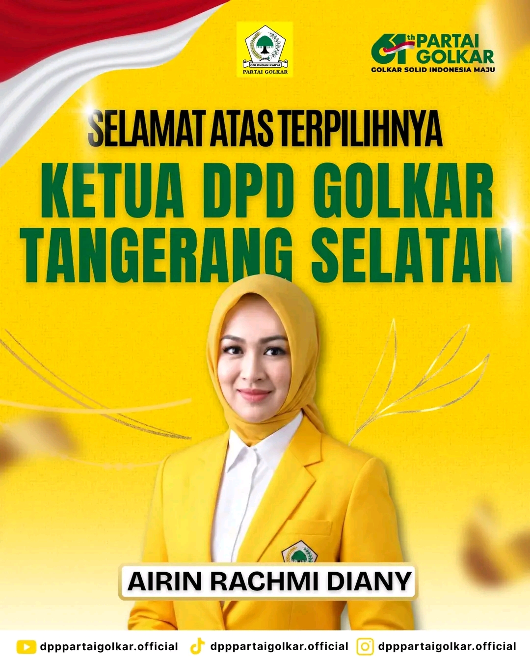 Dewan Pimpinan Pusat (DPP) Partai Golkar menyampaikan ucapan selamat atas terpilihnya Airin Rachmi Diany sebagai Ketua Dewan Pimpinan Daerah (DPD) II Partai Golkar Kota Tangerang Selatan (Tangsel).