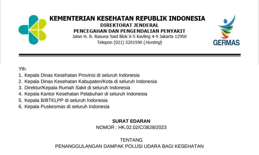 Kementerian Kesehatan RI melalui Direktorat Jenderal Pencegahan dan Pengendalian Penyakit menerbitkan Surat Edaran (SE) nomor : HK.02.02/C/3628/2023 tentang Penanggulangan Dampak Polusi Udara Bagi Kesehatan. Surat Edaran ini ditujukan kepada dinas kesehatan provinsi, kabupaten/kota, direktur rumah sakit, kantor Kesehatan Pelabuhan, B/BTKLPP, dan puskesmas.