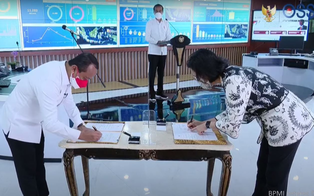 Penandatanganan dilakukan pada acara Peluncuran Sistem Online Single Submission (OSS) Berbasis Risiko, di Pusat Komando Operasi dan Pengawalan Investasi, Kementerian Investasi/BKPM, Jakarta, Senin (09/08/2021) pagi.