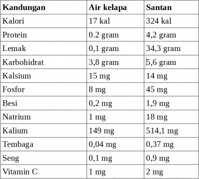 Berdasarkan deretan di atas, air kelapa dan santan memiliki perbedaan yang signifikan pada kalori. Air kelapa merupakan minuman yang rendah kalori, sedangkan santan memiliki kalori yang 19 kali lebih besar.