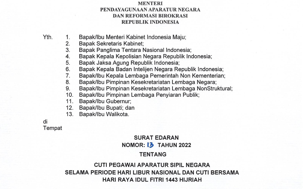 Hal tersebut tertuang dalam Surat Edaran (SE) Menteri PANR Nomor 13 Tahun 2022 tentang Cuti Pegawai Aparatur Sipil Negara Selama Periode Hari Libur Nasional dan Cuti Bersama Hari Raya Idulfitri 1443 Hijriah.