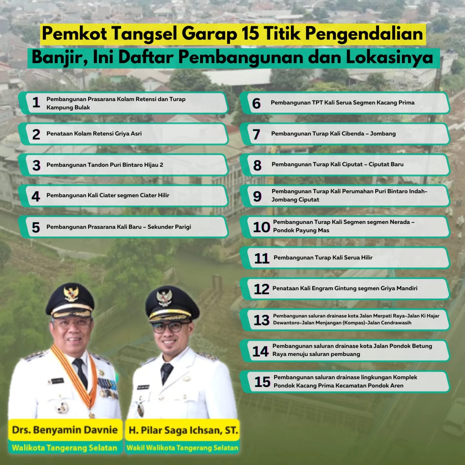 Adapun kelima belas titik pembangunan penanganan banjir oleh Pemkot Tangsel sebagai berikut: Pembangunan Prasarana Kolam Retensi dan Turap Kampung Bulak, Penataan Kolam Retensi Griya Asri, Pembangunan Tandon Puri Bintaro Hijau 2, Pembangunan Kali Ciater segmen Ciater Hilir, Pembangunan Prasarana Kali Baru – Sekunder Parigi, Pembangunan TPT Kali Serua Segmen Kacang Prima, Pembangunan Turap Kali Cibenda – Jombang, Pembangunan Turap Kali Ciputat – Ciputat Baru.