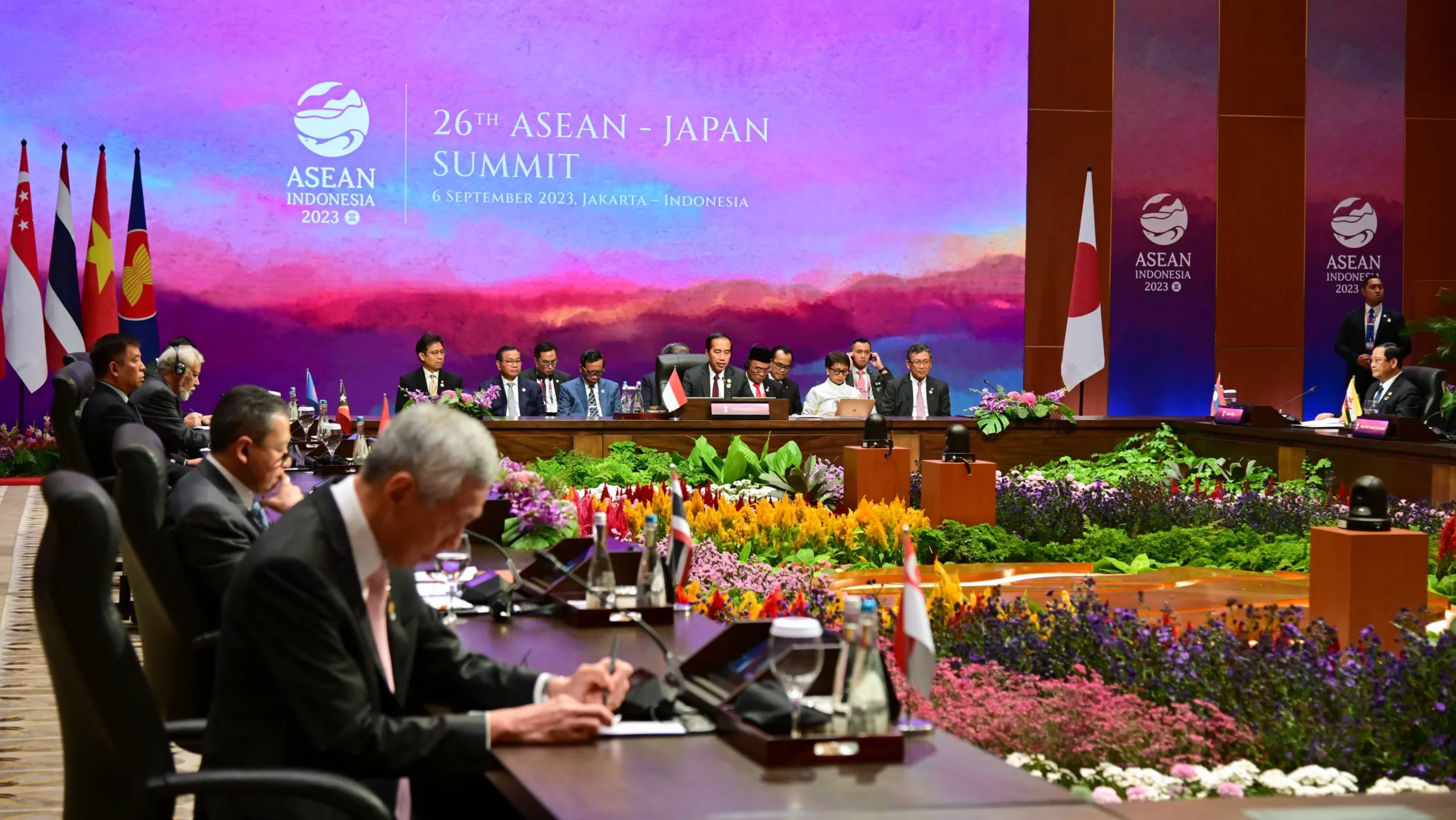 Presiden Joko Widodo membuka Konferensi Tingkat Tinggi (KTT) ke-26 ASEAN-Jepang yang digelar di Ruang Cendrawasih 3, Jakarta Convention Center (JCC), Jakarta, pada Rabu, 6 September 2023. Dalam pidato sambutannya, Presiden Jokowi mengajak Jepang meningkatkan kontribusinya untuk mendukung konektivitas dan infrastruktur hijau di ASEAN.