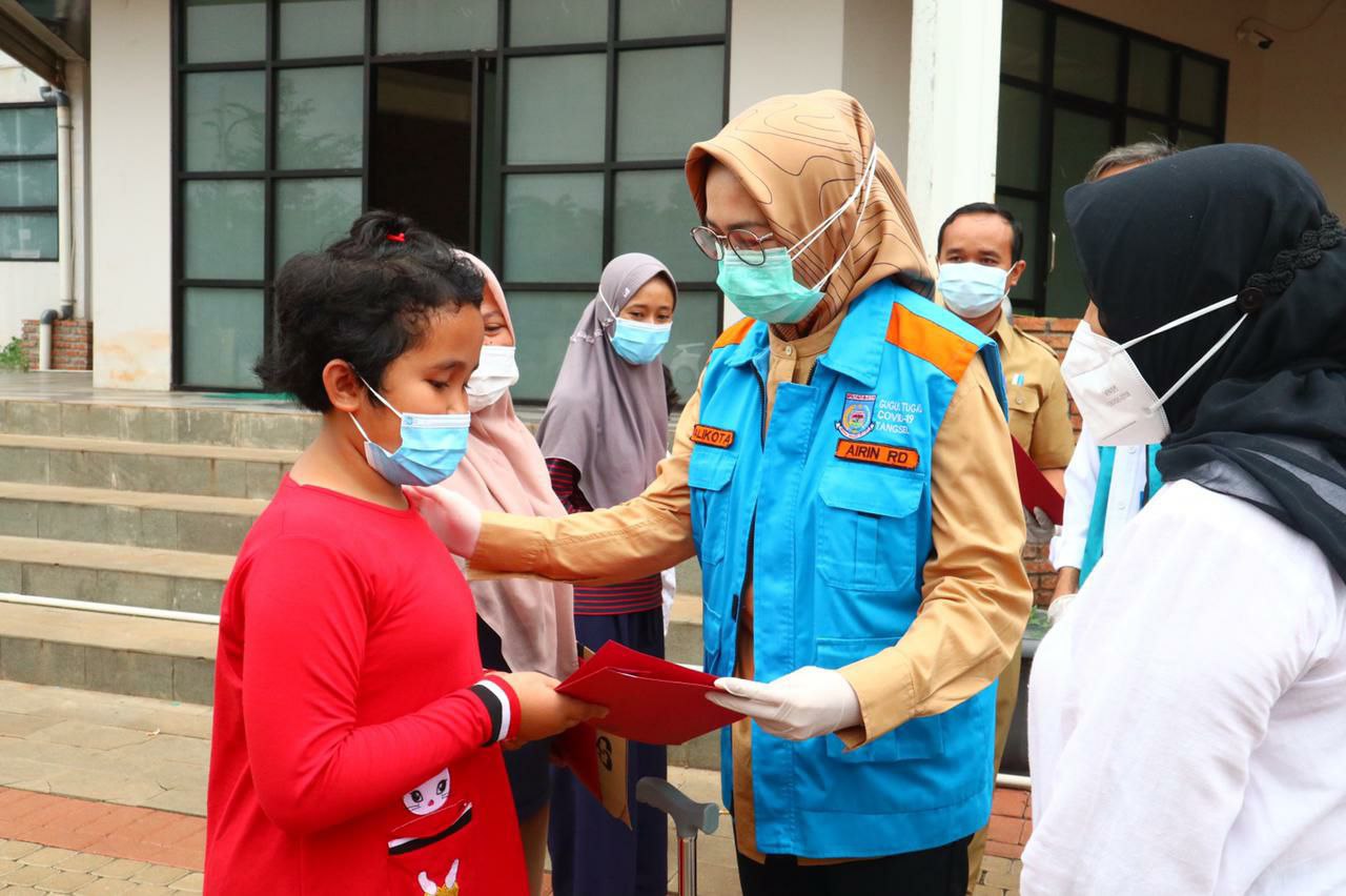 Walikota Tangerang Selatan (Tangsel) Airin Rachmi Diany melepas sebanyak 65 pasien yang sudah dinyatakan sembuh dan bebas dari Covid-19, Senin (5/4). Pasien itu sendiri sebelumnya dirawat selama beberapa hari di Rumah Lawan Covid-19 (RLC) Ciater, Serpong.