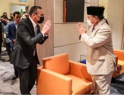 Menteri Pertahanan RI Prabowo Subianto melaksanakan pertemuan bilateral dengan Senior Minister of Defence Malaysia Yb Dato’ Seri Hishammuddin Tun Hussein sebelum melaksanakan Trilateral Ministerial Meeting Indomalphi, Senin (28/3), di Malaysia International Trade and Exhibition Centre (MITEC), Kuala Lumpur, Malaysia, di sela-sela pelaksanaan Defence Services Asia Exhibition and National Security Conference Asia 2022.