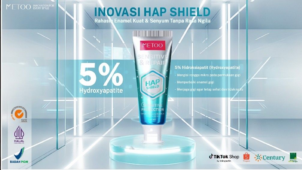 “Metoo HAP Shield Toothpaste cocok untuk mereka yang memiliki gigi sensitif dan gigi ngilu. Pasta gigi ini mengandung 5% Hidroksiapatit (HAP), yang mengisi lubang-lubang kecil di permukaan gigi, memperbaiki enamel gigi, menjaga gigi tetap kuat dan sehat, serta mencegah gigi berlubang,” jelas