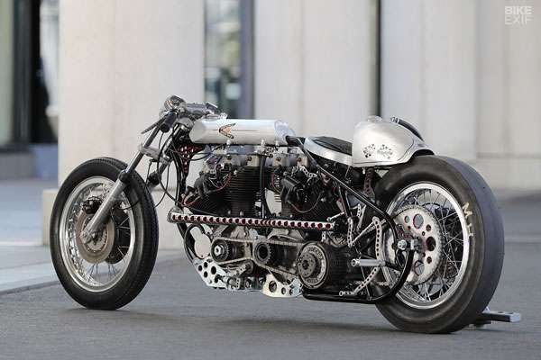 Kokpitnya sederhana dengan tachometer Harley 1970-an tepat di depan. Bodywork aluminium minimalis namun terlihat ekstrem disajikan seperti duduk di atas tabung bingkai dan penutup pada belakang kursi yang merangkap sebagai tangki BBM.
