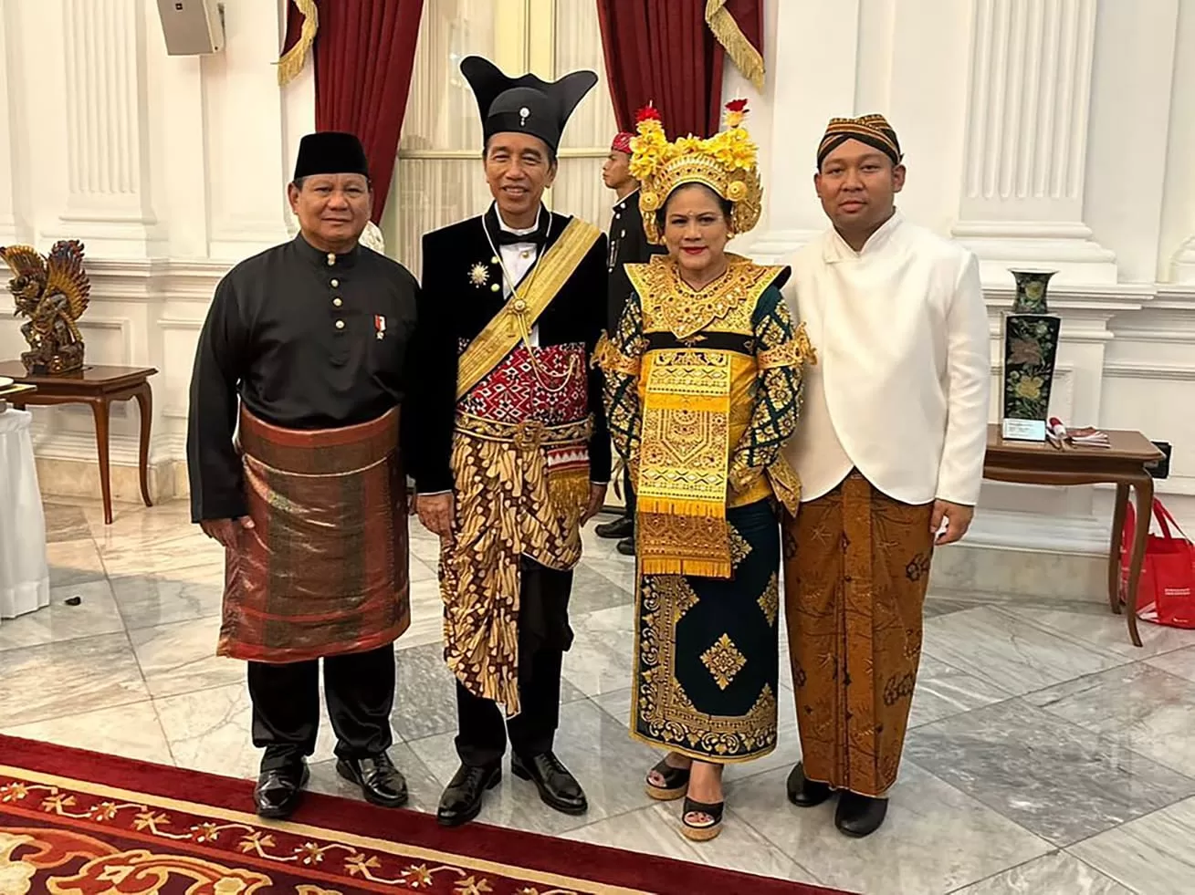 “Kekuatan Indonesia yang keberagaman yang bisa dipersatukan. Jadi kalau kita bersatu, solid, kompak, itulah kekuatan besar Indonesia,” kata Presiden Jokowi yang mengenakan baju daerah Ageman Songkok Singkepan Ageng.