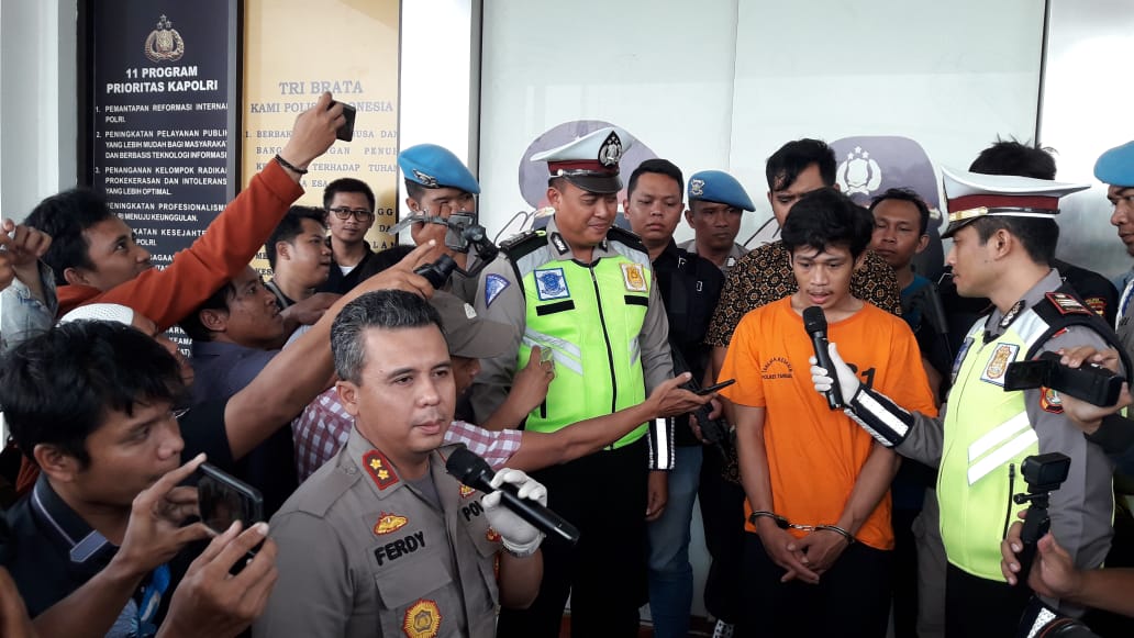 Kabartangsel.com- Polresta Tangerang Selatan langsung mengahadirkan Adi Saputra di pembanting motor yang videonya viral sejak kemarin. Dengan mengenakan kostum baju tahanan berwarna orange, Adi Saputra menyesali perbuatannya dengan kalimat terbata-bata dan wajah menahan air mata.