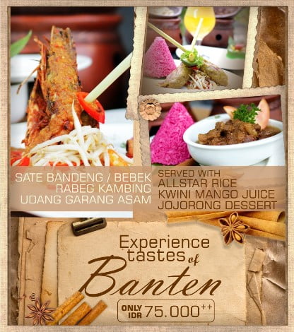Santapan khas para Sultan Banten ini, jelas Cut Nyak Latifah, dibandrol dengan harga Rp. 75.000 ++ per paketnya sudah dilengkapi dengan minuman dan juga dessert yang lezat dan bisa dinikmati dibeberapa outlet dari Hotel Mercure Serpong Alam Sutera. Santapan khas para Sultan Banten tersebut diantaranya, Mint & Pepper Restaurant, Mocca Lounge Bar, Maniz Pooldeck dan Room Service. Adapun beberapa hidangan khas Banten ini yang akan disajikan mulai dari Sate Bebek, Sate Bandeng, Rabeg Kambing, Udang Garang Asam, Jus Mangga Kwini hingga jajanan khas Banten yaitu Jojorong.