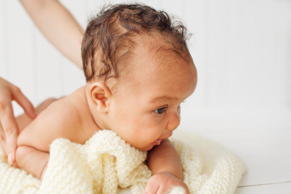 Baringkan buah hati Anda pada punggungnya dan pastikan telapak tangan Anda sudah cukup hangat, tidak terlalu dingin atau panas di kulit bayi.