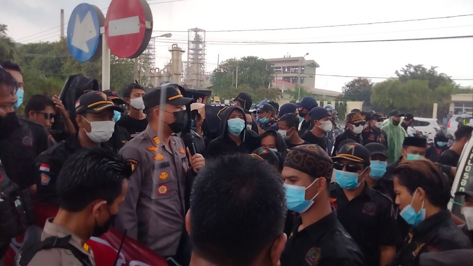 Pengamanan unjuk rasa di PT Chandra asri jalan raya Anyer KM 123 Kelurahan Gunung Sugih Kecamatan Ciwandan Kota Cilegon, Kapolsek Ciwandan berikan imbauan Prokes kepada pengunjuk rasa pada Jumat (5/11).