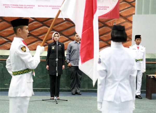 Wali Kota Tangerang Selatan Airin Rachmi Diany mengukuhkan 50 Anggota Paskibraka Kota Tangsel di Gedung Widya Bhakti Puspiptek, Setu (15/8).