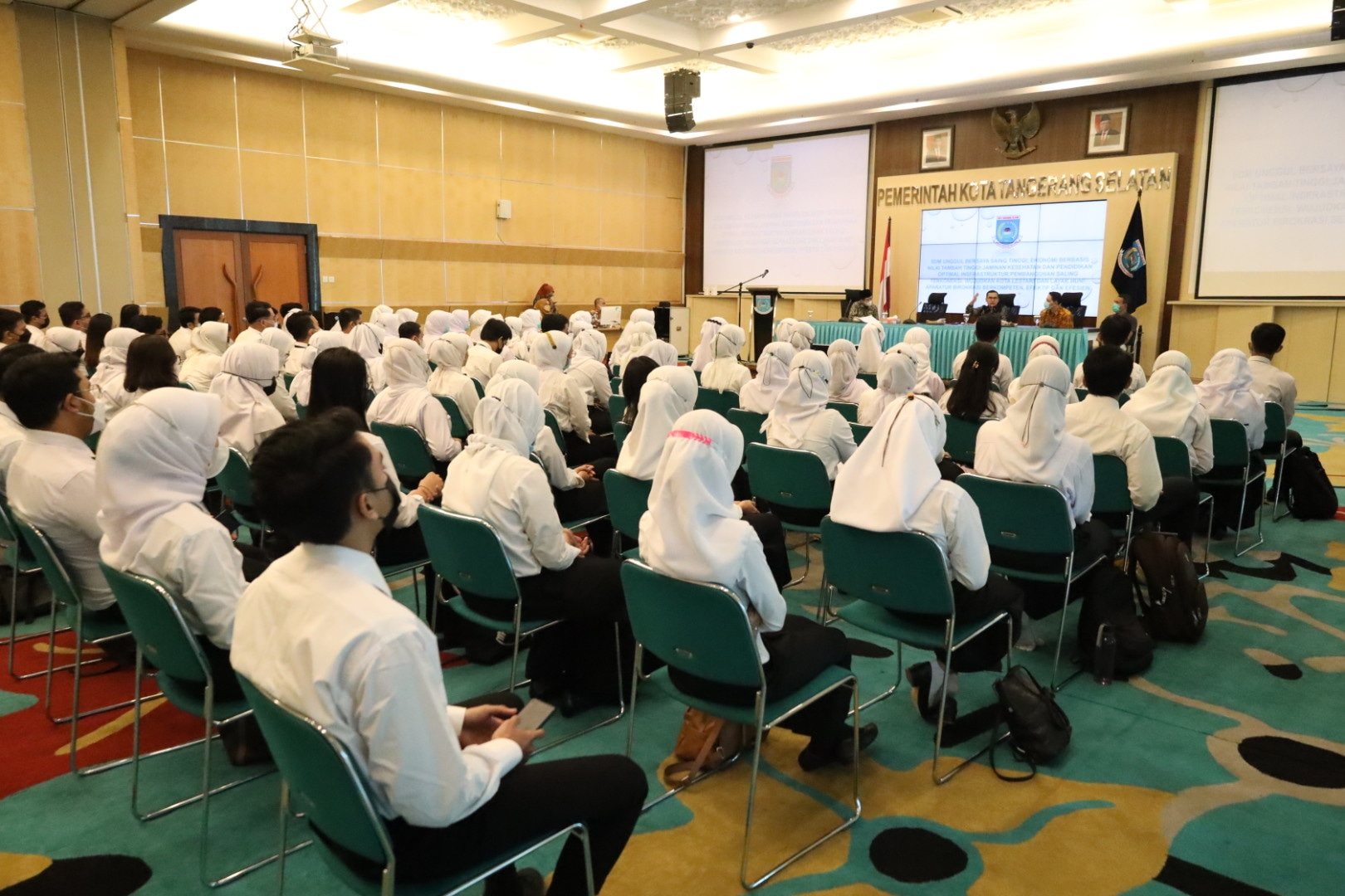 Wakil Wali Kota Pilar Saga Ichsan memberikan arahan dalam pembekalan Pelatihan Dasar (Latsar) Calon Pegawai Negeri Sipil (CPNS) Golongan II angkatan 74, 75 dan 78 di Aula Blandongan, Puspemkot Tangsel yang diikuti 91 CPNS Kota Tangsel angkatan 2021, Kamis (28/07).