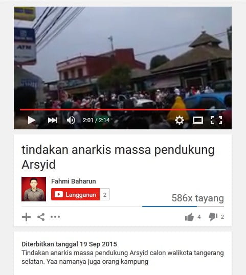 Rekaman video aksi anarkis yang dilakukan pendukung pasangan calon (paslon) Walikota dan Wakil Walikota Tangsel, Arsid-Elvier, beredar di laman youtube. Rekaman itu diposting 19 September 2015 lalu.