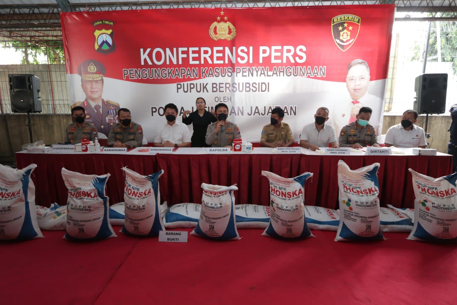 Kapolda Jatim Irjen. Pol. Nico Afinta didampingi oleh Direktur Reserse Kriminal Khusus polda Jatim Kombes Pol Farman, Kabid Perdagangan Dalam Negeri Disperindag Jatim, Ahli Madya Fungsional Sarpras Dinas Pertanian Jatim dan Kabid Humas Polda Jatim Kombes Dirmanto memimpin konferensi press terkait pengungkapan kasus penyalahgunaan pupuk bersubsidi yang diungkap oleh Direktorat Kriminal Khusus polda Jawa timur. Senin (16/5/22)