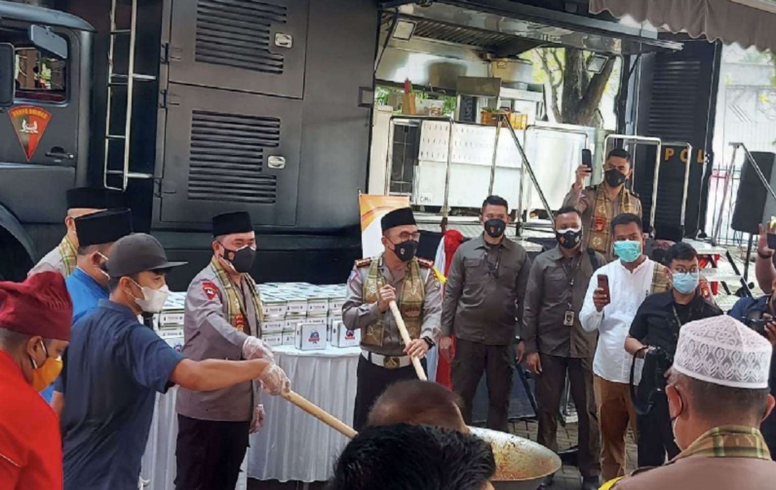 Dalam kesempatan itu, Kapolda Metro Jaya Fadil Imran Dibantu Dirlantas Polda Metro Jaya Kombes Pol Sambodo Purnomo Yogo dan Kabid Humas Polda Metro Jaya Kombes Pol Yusri Yunus turut mengaduk rendang yang sedang dimasak untuk kemudian dikemas dan didistribusikan ke seluruh jajaran Polres dan Polsek di wilayah hukum Polda Metro Jaya.