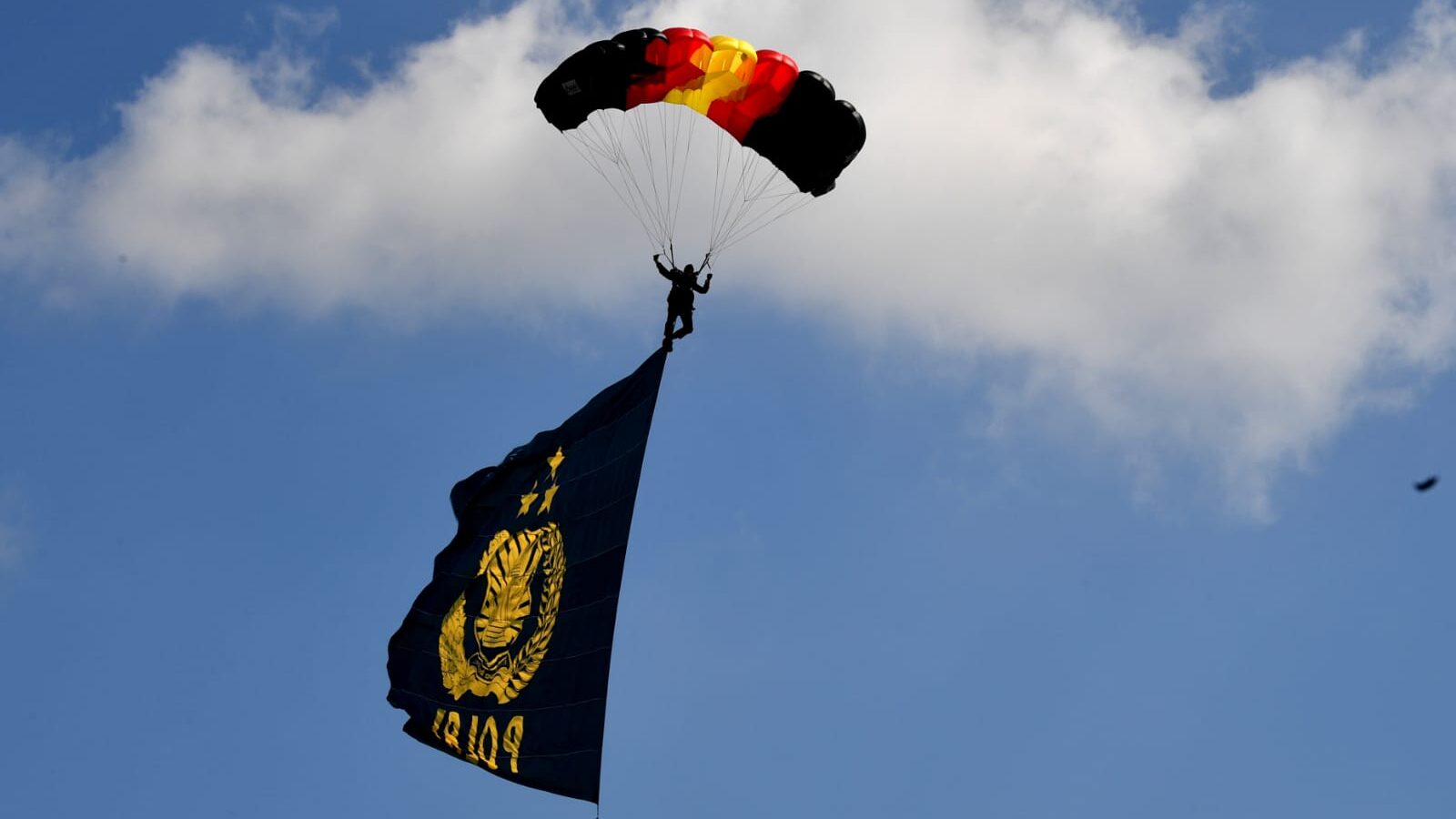 Atraksi terjun payung oleh 41 penerjun gabungan dari Polri dan TNI disuguhkan secara langsung di hadapan Presiden dan Ibu Iriana juga undangan yang hadir. Beberapa penerjun terakhir tampak membawa bendera raksasa yakni bendera presisi Polri, bendera Bhayangkara, bendera Mabes TNI, dan bendera Merah Putih.
