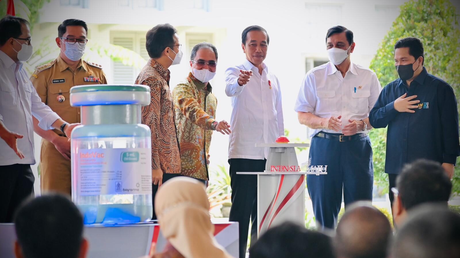 Presiden Joko Widodo meluncurkan vaksin Covid-19 buatan Bio Farma, IndoVac, di Pabrik PT Bio Farma (Persero), Kota Bandung, Provinsi Jawa Barat, pada Kamis, 13 Oktober 2022. Dalam sambutannya, Presiden berharap Bio Farma terus didorong agar Indonesia bisa memiliki kemandirian dalam hal vaksin.