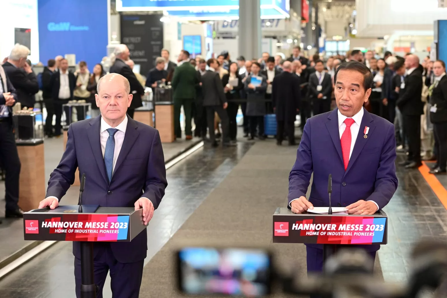 Hal tersebut disampaikan oleh Presiden Jokowi dalam keterangannya usai meninjau sejumlah stan yang ada di Hannover Messe 2023, pada Senin (17/04/2023). Tampak Kanselir Jerman Olaf Scholz turut meninjau stan bersama Presiden dan Ibu Iriana.