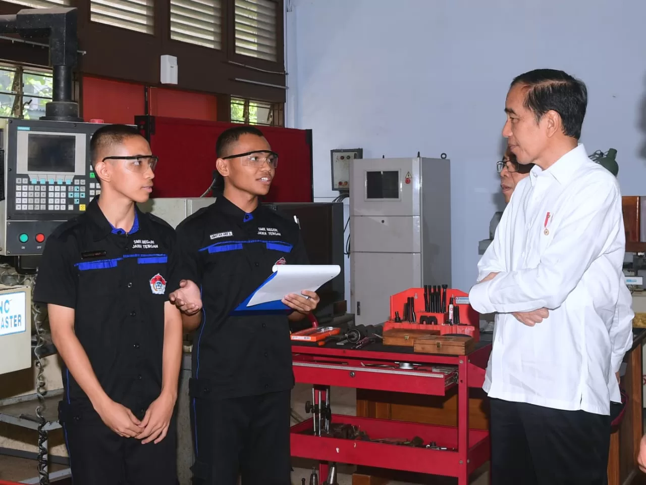 “Kalau saya melihat SMK di provinsi yang lain, ini juga jauh lebih bagus. Mesin-mesinnya sampai ke CNC (computer numerical control) semua mesin dasar, sampai CNC semuanya ada semuanya. Kemudian me-link-an dengan industri, di sini juga sudah di-link-kan dengan industri,” ungkap Presiden.