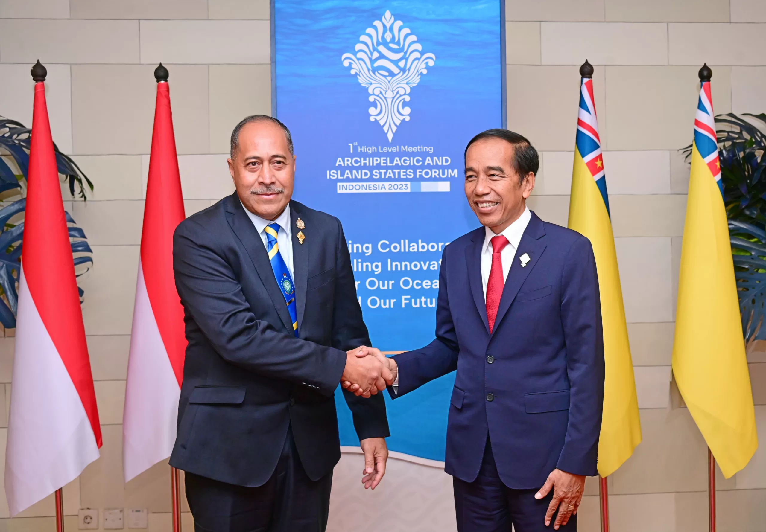 Presiden RI Joko Widodo (Jokowi) menggelar pertemuan bilateral dengan Premier Niue, Dalton Emani Makamau Tagelagi di Bali Nusa Dua Convention Center (BNDCC), Kabupaten Badung, Provinsi Bali, pada Rabu (11/10/2023). Pertemuan bilateral tersebut digelar di sela-sela Konferensi Tingkat Tinggi (KTT) Forum Negara-Negara Kepulauan dan Negara Pulau (Archipelagic and Island States Forum).