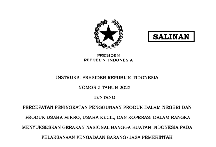 Presiden RI Joko Widodo (Jokowi) mengeluarkan Instruksi Presiden Republik Indonesia (Inpres) Nomor 2 Tahun 2022 tentang Percepatan Peningkatan Penggunaan Produk Dalam Negeri dan Produk Usaha Mikro, Usaha Kecil, dan Koperasi dalam rangka Menyukseskan Gerakan Nasional Bangga Buatan Indonesia pada Pelaksanaan Pengadaan Barang/Jasa Pemerintah.